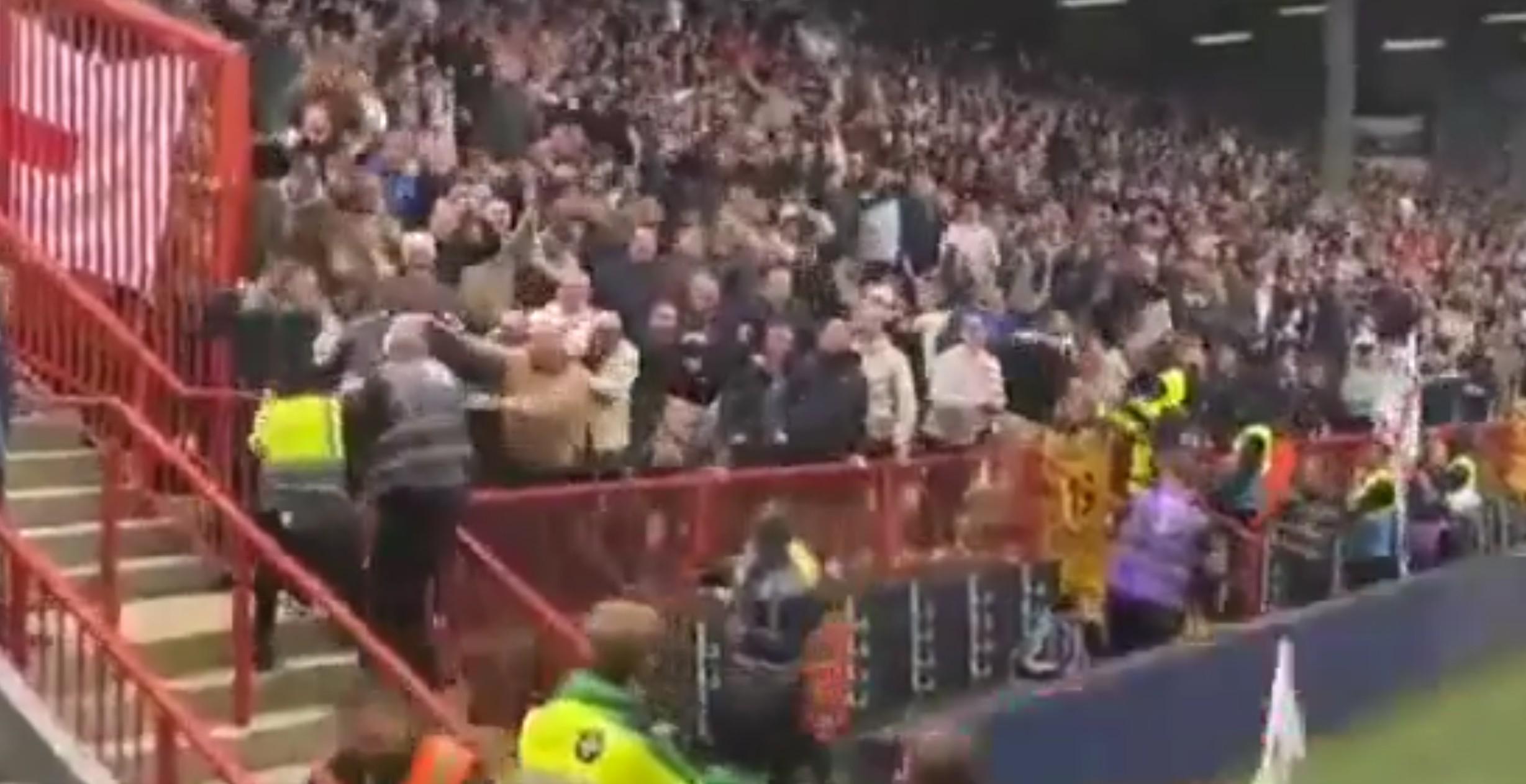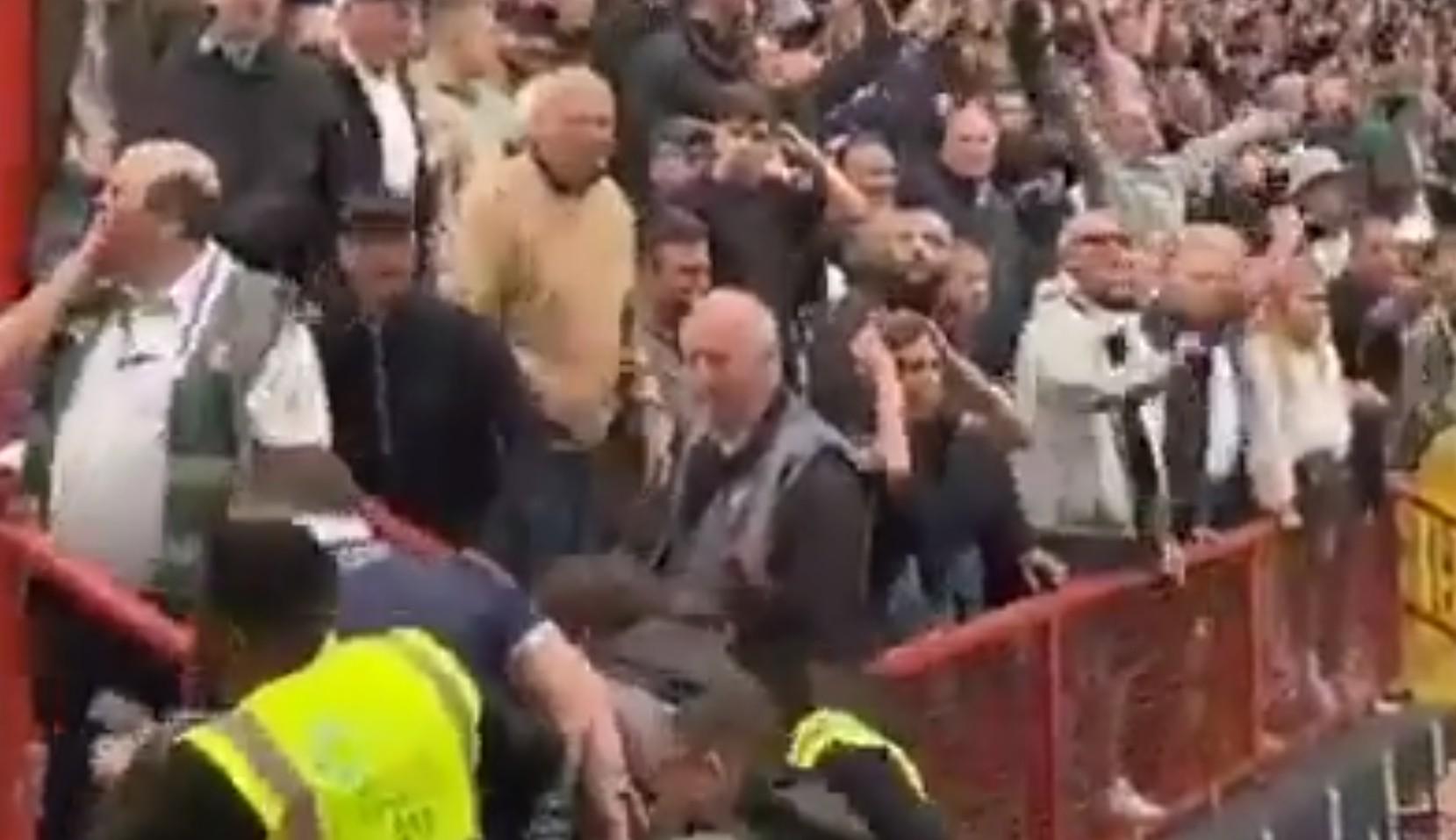 据悉,在米尔沃尔队88分钟打入绝平球后,这位老哥一激动就想翻栏杆闯进客队看台,结果客队球迷误以为他是来挑衅的主队球迷,直接一拳招呼过去。而这位老哥被打以后显然也有点懵,随后他转向另一侧看台试图再次翻越,但又被米尔沃尔远征军当成了来挑衅的主队球迷殴打。好在随后安保及时赶到将他保护了起来。